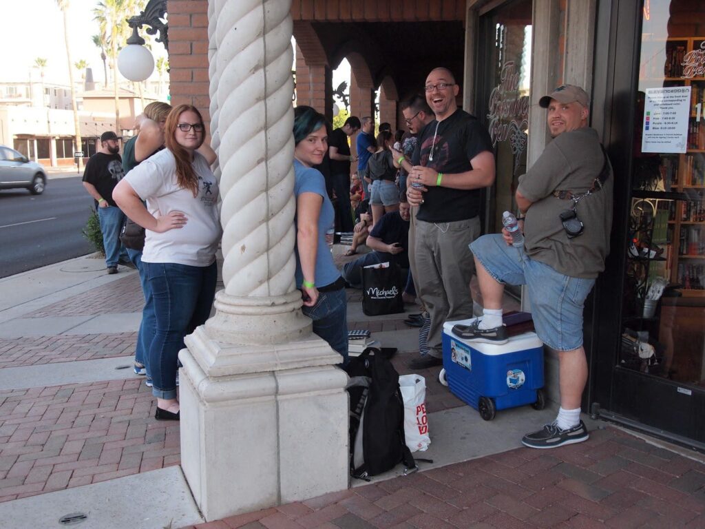 Earlier this week, Kevin Hearne hosted a Scifi Extravaganza at The Poisoned Pen. What makes it so special? Well, if you’re a science fiction or fantasy fan, how about these names? Patrick Rothfuss, Brandon Sanderson, Pierce Brown, Beth Cato, Adam Christopher, Ryan Dalton, Leanna Renee Hieber, Jason Hough, Mary Robinette Kowal, Tom Leveen, Michael Martinez, Brian McClellan, Joseph Nassise, Sarah Remy, VE Schwab, Scott Sigler, Michael J. Sullivan, Sam Sykes, Dan Wells, Django Wexler. People lined up early to get wristbands, meet the authors, and get books signed.