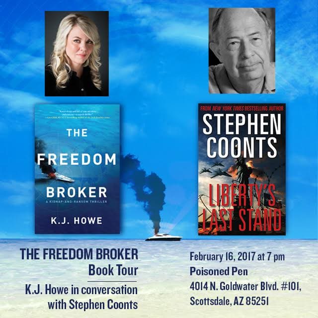 Hope you can make it to The Poisoned Pen on Thursday, Feb. 16 at 7 PM when Stephen Coonts (Liberty’sLast Stand) moderates a conversation with Charles Cumming (A Divided Spy) and K.J. Howe (The Freedom Broker).